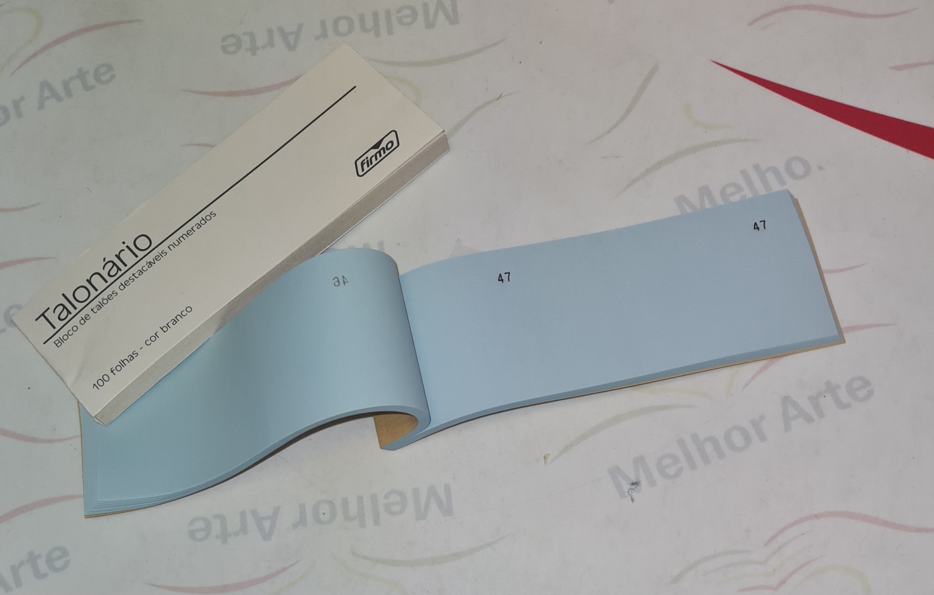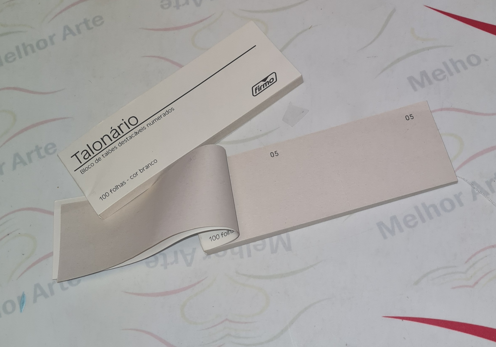 Talonário branco com texto e folhas numeradas sobre superfície com padrão.