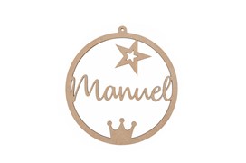Adorno decorativo redondo de madeira com nome Manuel, coroa e estrela