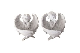 Par de esculturas de anjos brancos em cerâmica/resina com asas detalhadas