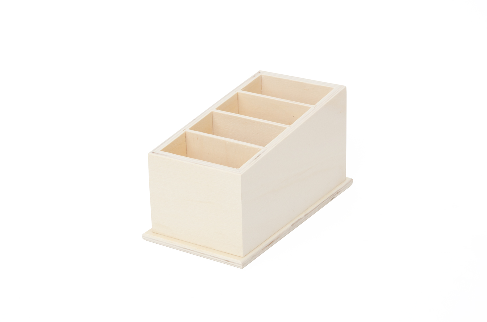 Organizador de madeira clara com quatro compartimentos inclinados