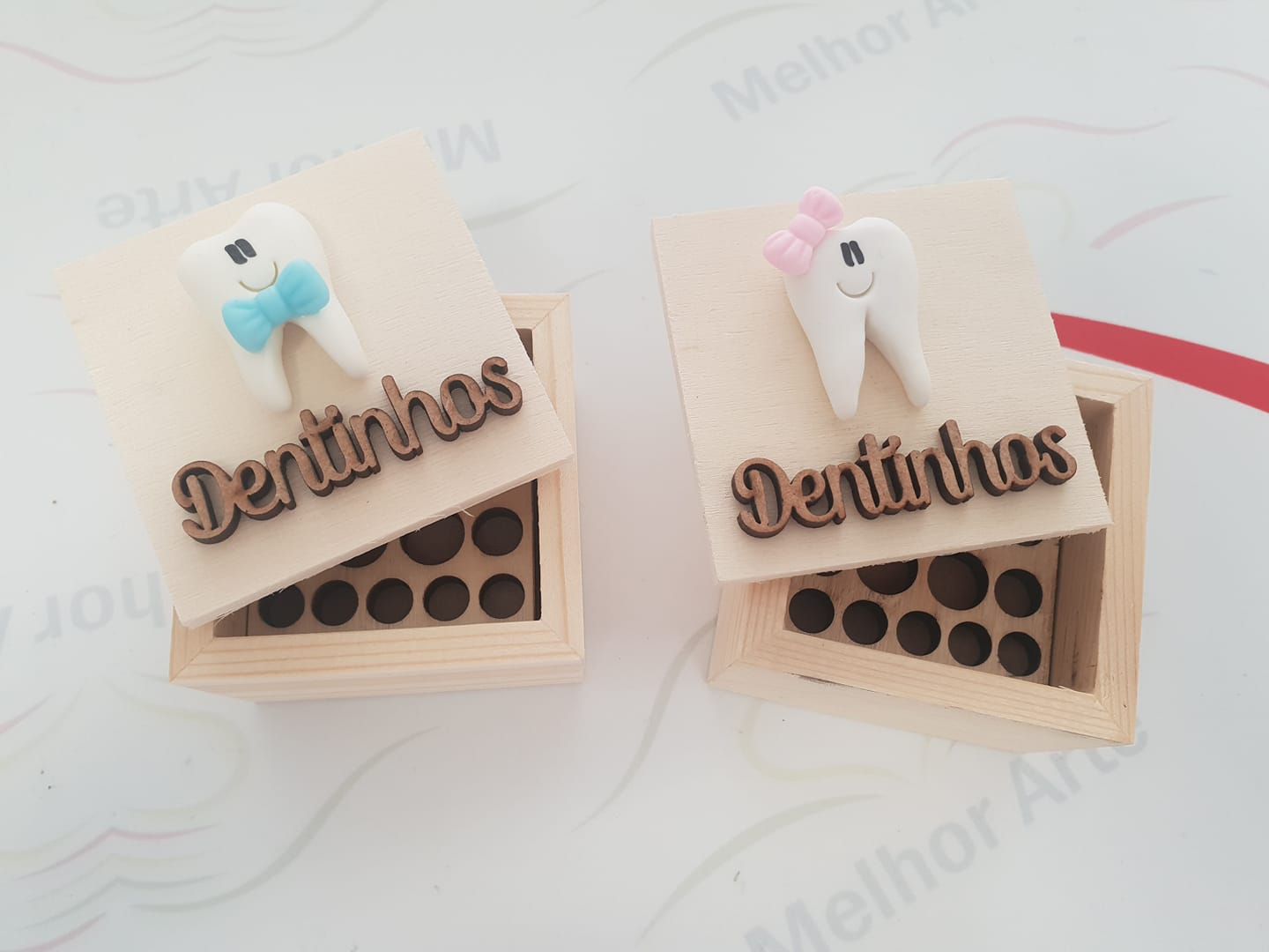Caixas de madeira com tampas decoradas com dentes em cerâmica com laços e a palavra Dentinhos