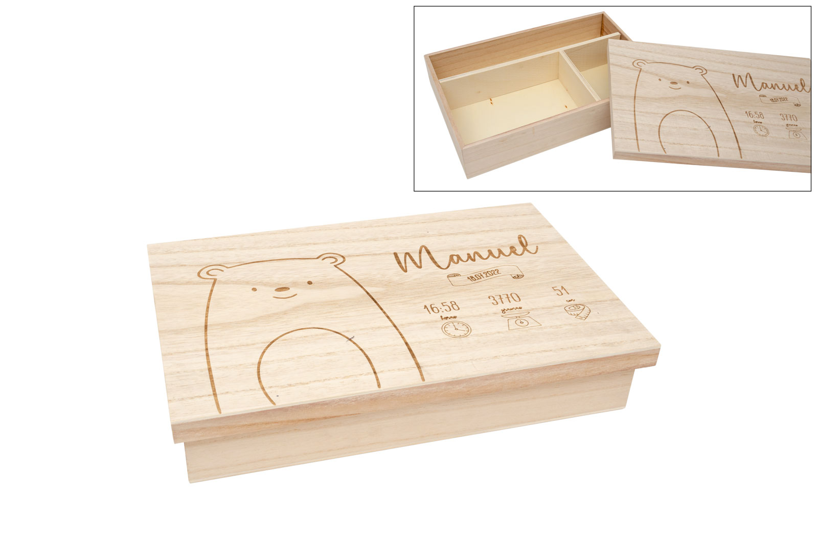 Caixa de madeira com divisões para guardar as recordações do nascimento, como por exemplo a primeira chucha, a pulseirinha do hospital, os primeiros sapatinhos, ou até as primeiras fotografias. A tampa é gravada a laser com o nome e os dados do nascimento, a decoração é complementada com um ursinho amoroso.