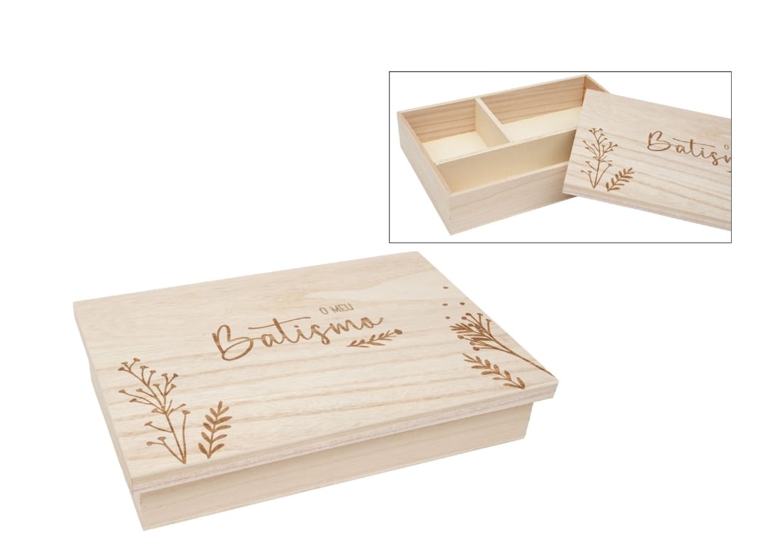 Caixa de madeira com divisões para guardar os itens de Batismo, como vela, toalha e concha. Na tampa da caixa é gravado a laser "O meu Batismo". Para complementar a decoração, a caixa é também gravada com folhagens.