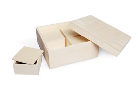 Caixa de madeira clara com tampa removível e duas caixas pequenas