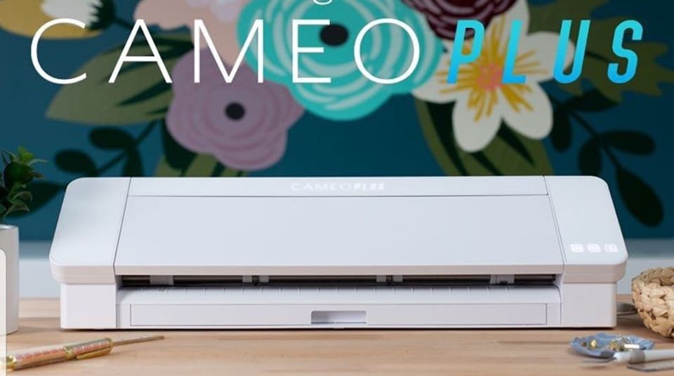 Cortador eletrônico branco CAMEO PLUS com fundo floral colorido