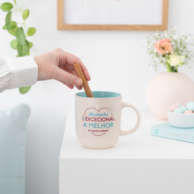 Caneca com texto colorido sobre mesa branca, com mão a mexer e decoração floral