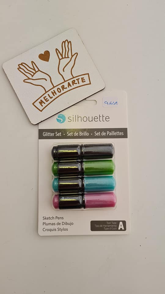 Conjunto de canetas glitter Silhouette em embalagem branca com logo MELHORARTE