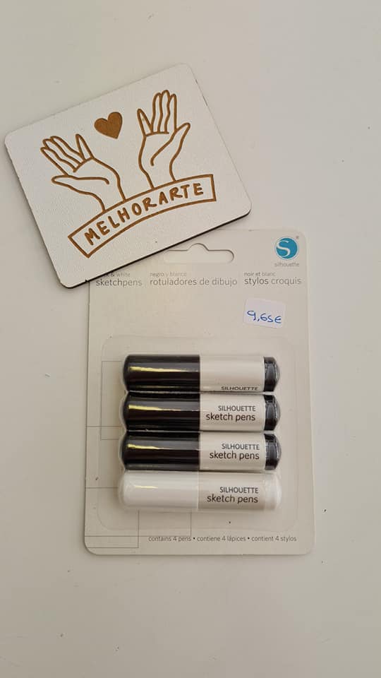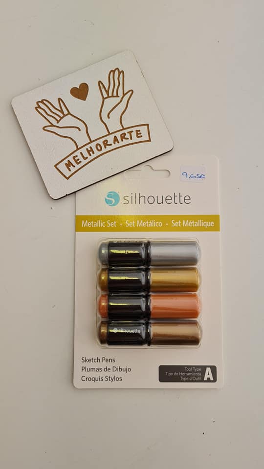 Conjunto de canetas metálicas Silhouette e quadrado branco com desenho de mãos e texto MELHORARTE