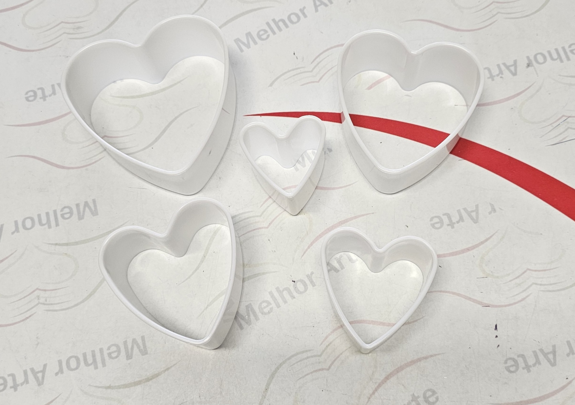Conjunto de cortadores de massa em forma de coração brancos sobre fundo branco com texto e linha vermelha
