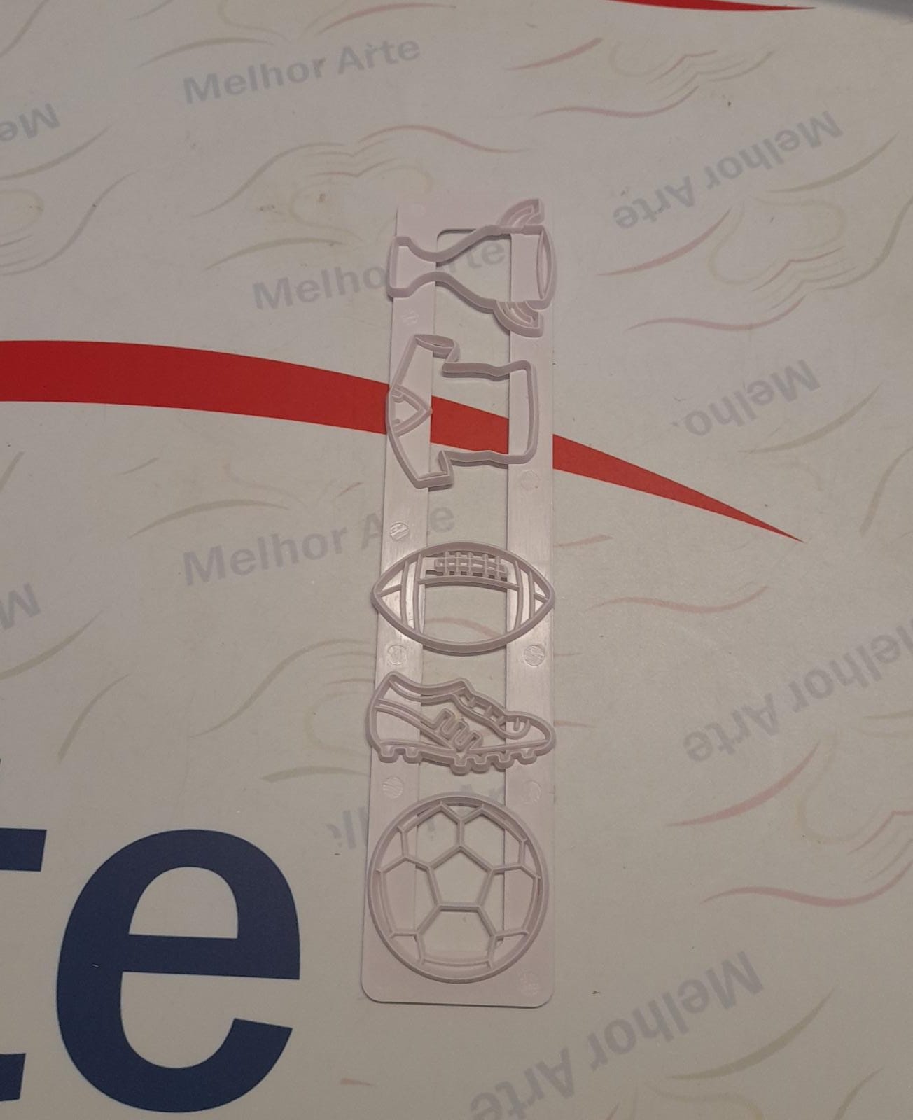 Cinco cortadores temáticos de futebol em plástico transparente sobre fundo branco com texto e linhas coloridas.