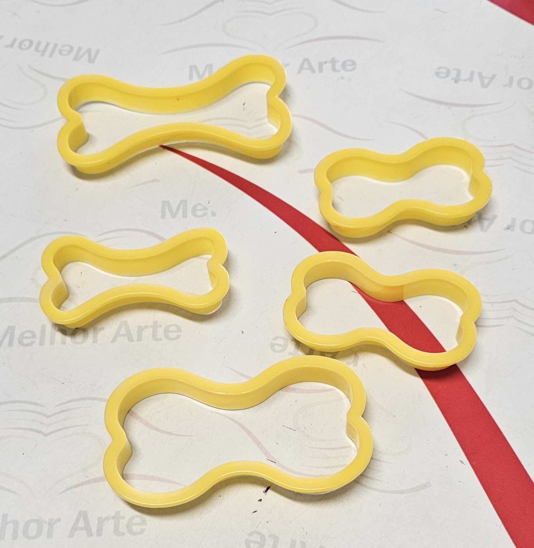 Conjunto de moldes amarelos em forma de osso sobre superfície branca e vermelha.