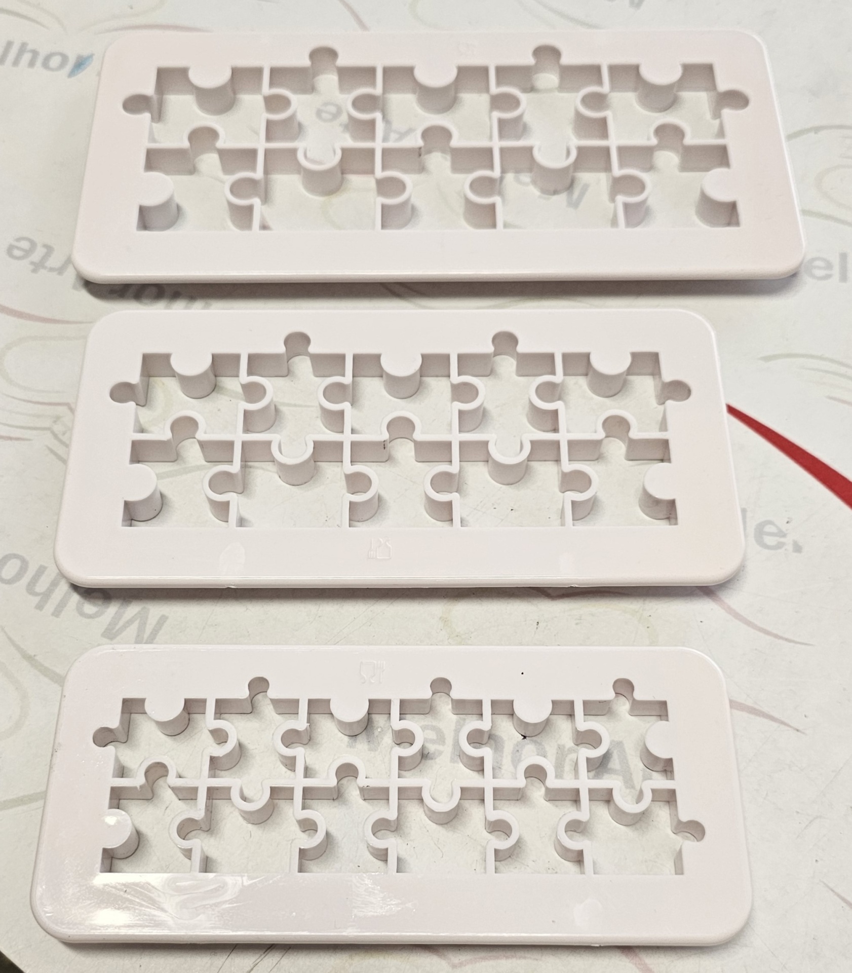 Três moldes de plástico branco com formato de peças de puzzle sobre superfície branca
