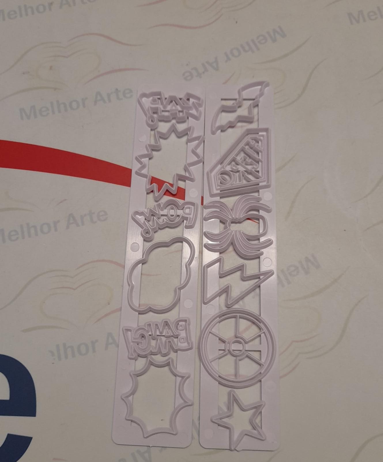 Moldes de plástico translúcido com formas e palavras sobre mesa clara com texto Melhor Arte