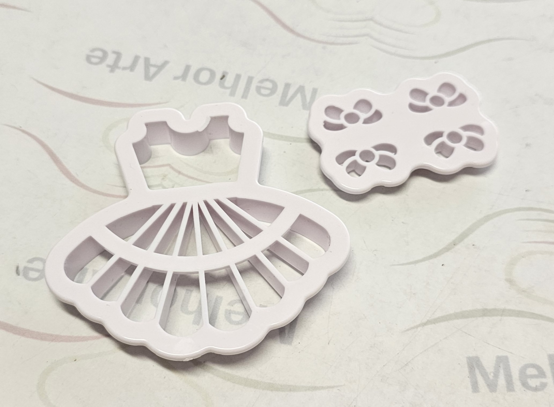 Cortadores de bolachas brancos em formato de vestido e pegadas sobre superfície clara com texto