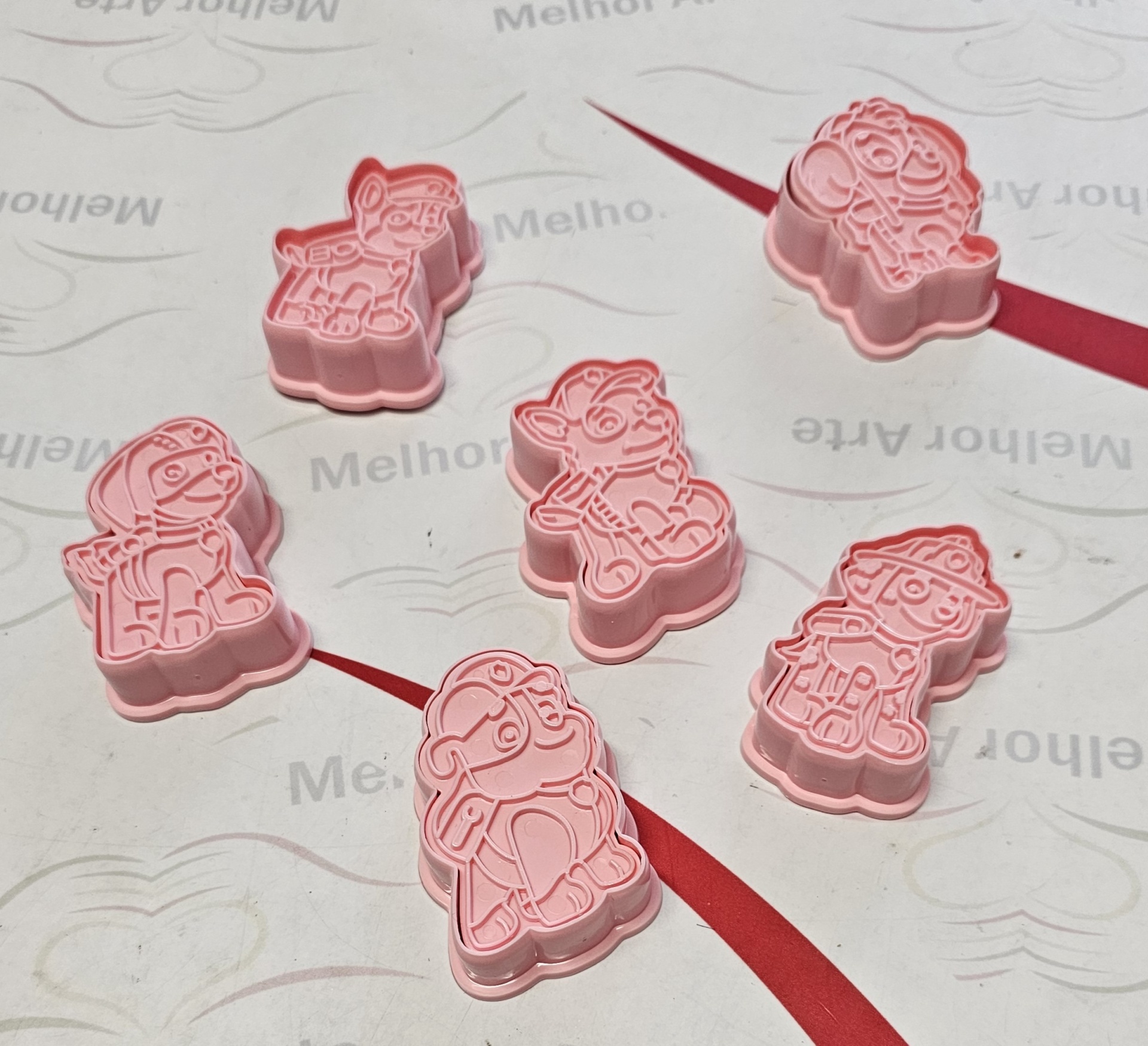 Moldes cor-de-rosa para biscoitos com formas de personagens animados sobre superfície branca com texto 'Melhor'