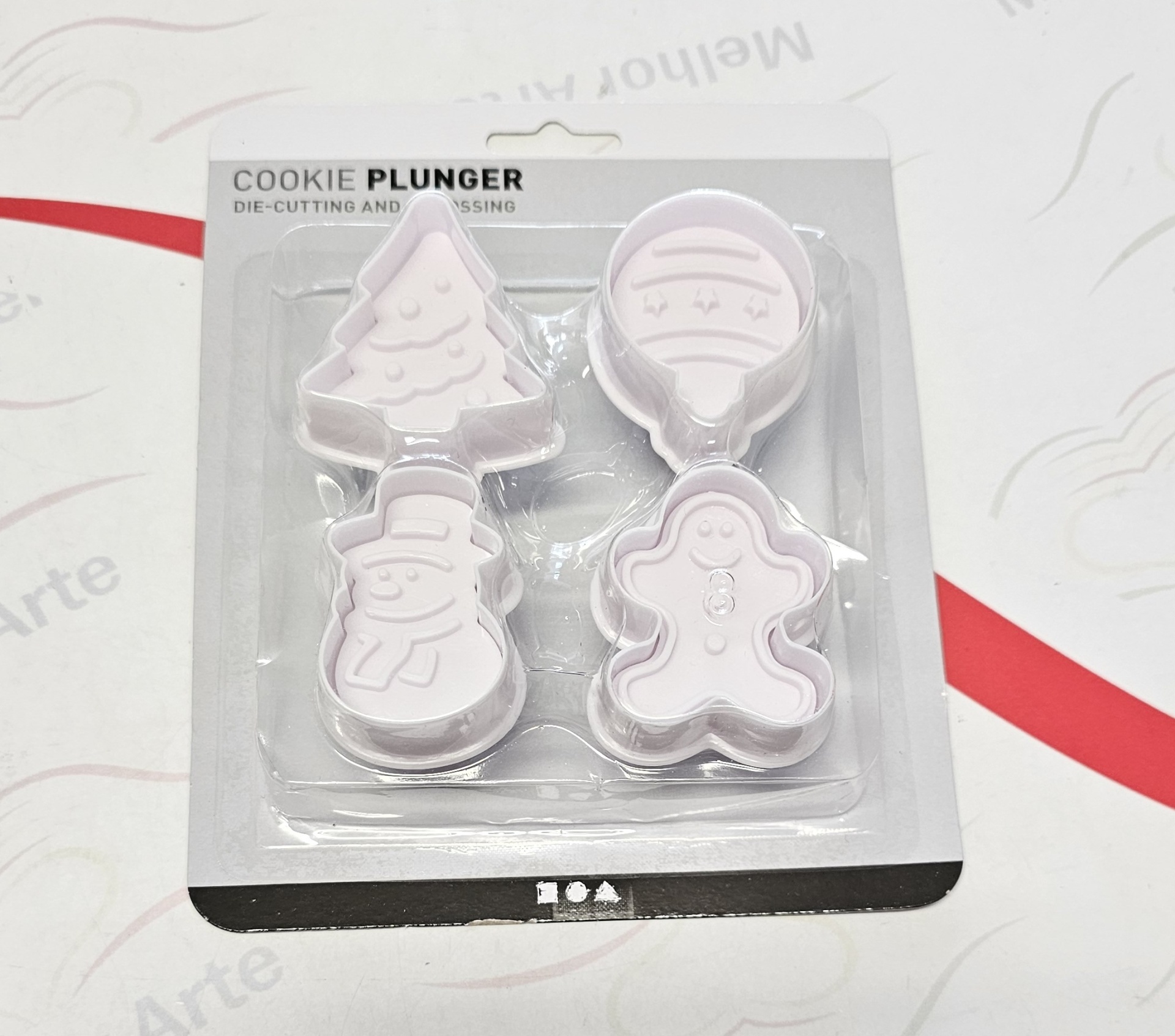 Conjunto de quatro cortadores de bolachas natalícios em plástico branco em embalagem