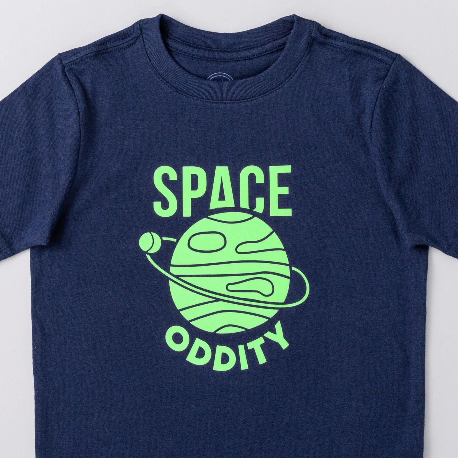 T-shirt azul escuro com estampado verde ângulo e texto 'SPACE ODDITY'