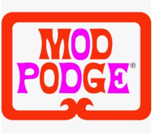 Logótipo da marca MOD PODGE em cores vermelha e lilás com moldura retangular vermelha