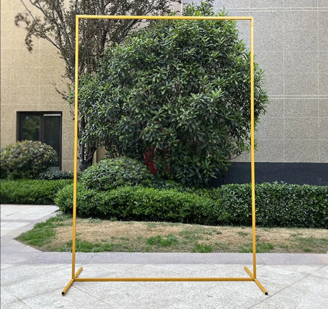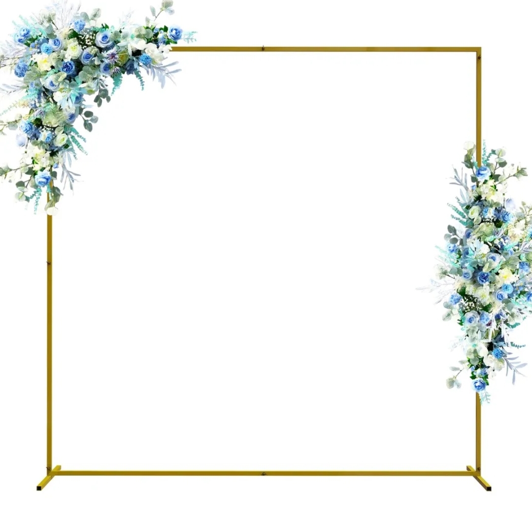 Estrutura retangular dourada com arranjos florais artificiais em tons de rosa e dourado