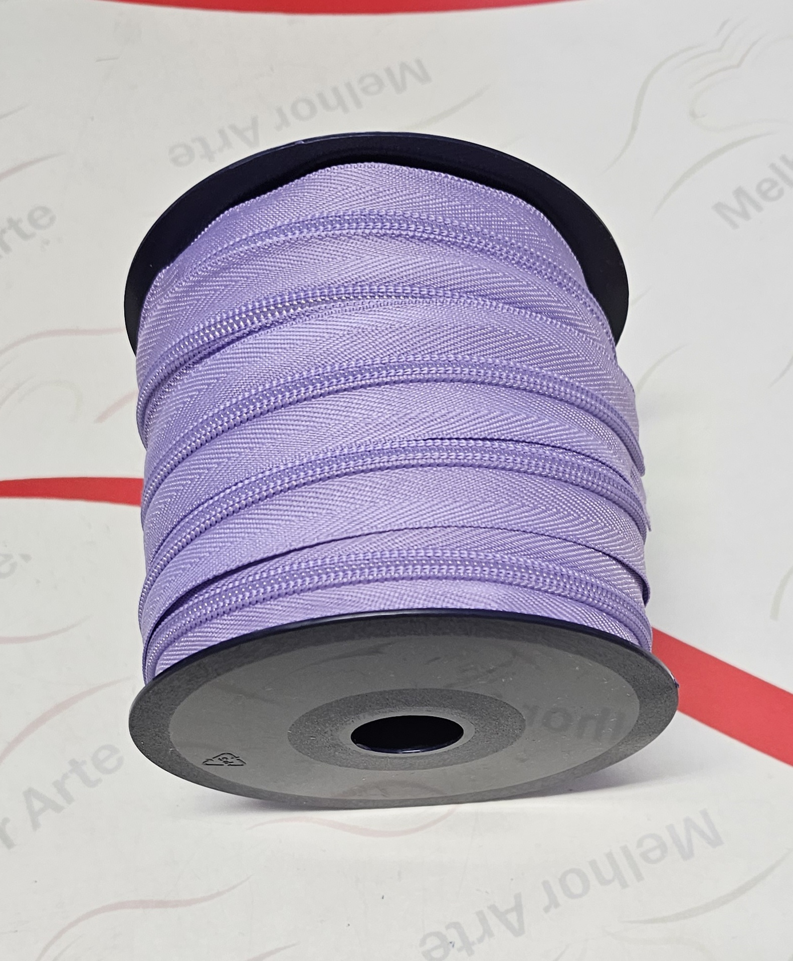 Rolo de fita lilás num carretel preto sobre superfície branca com texto