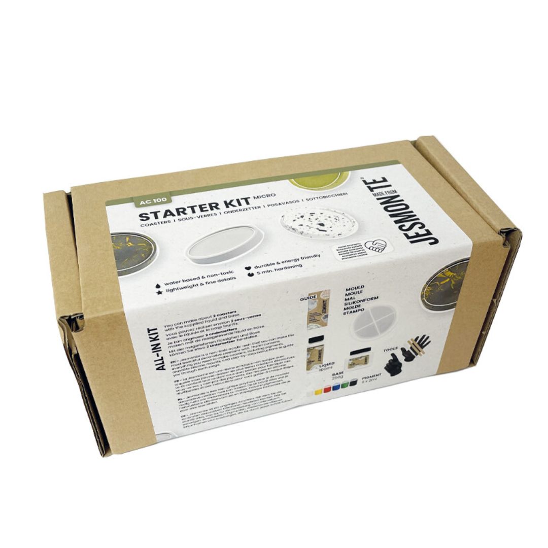 Kit de iniciação para bases de copos em embalagem de cartão castanho e etiqueta branca