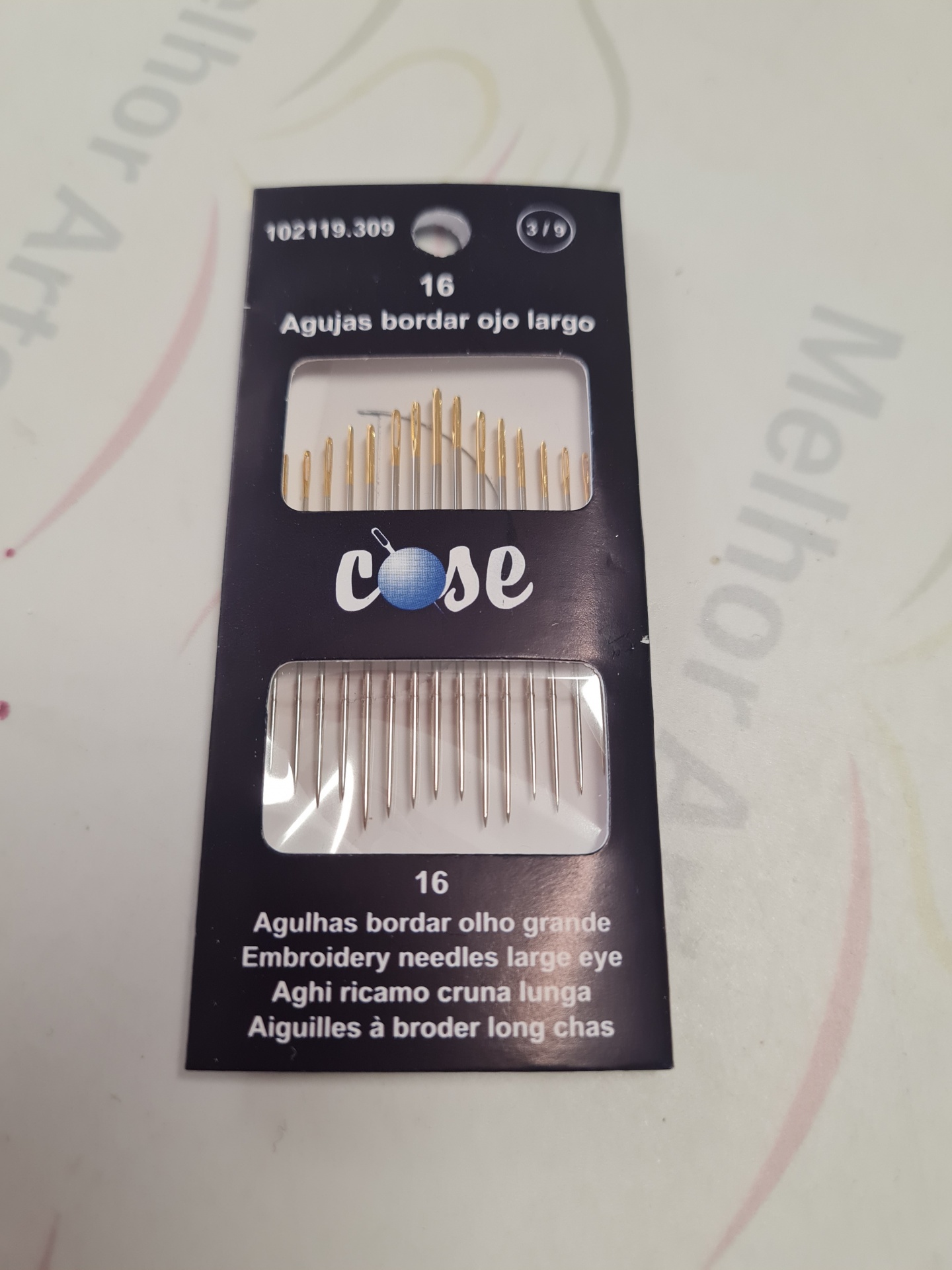 Cartão com 16 agulhas para bordar olho largo em duas fileiras, texto em várias línguas
