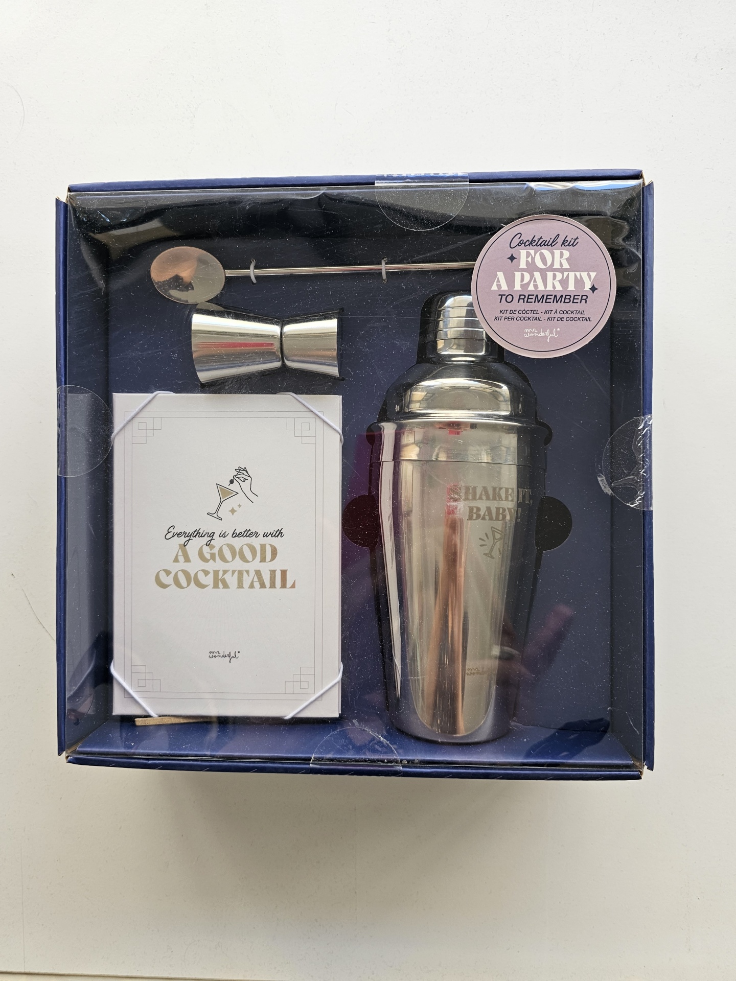 Conjunto de cocktail com shaker metálico, dosador, colher e livro em caixa azul