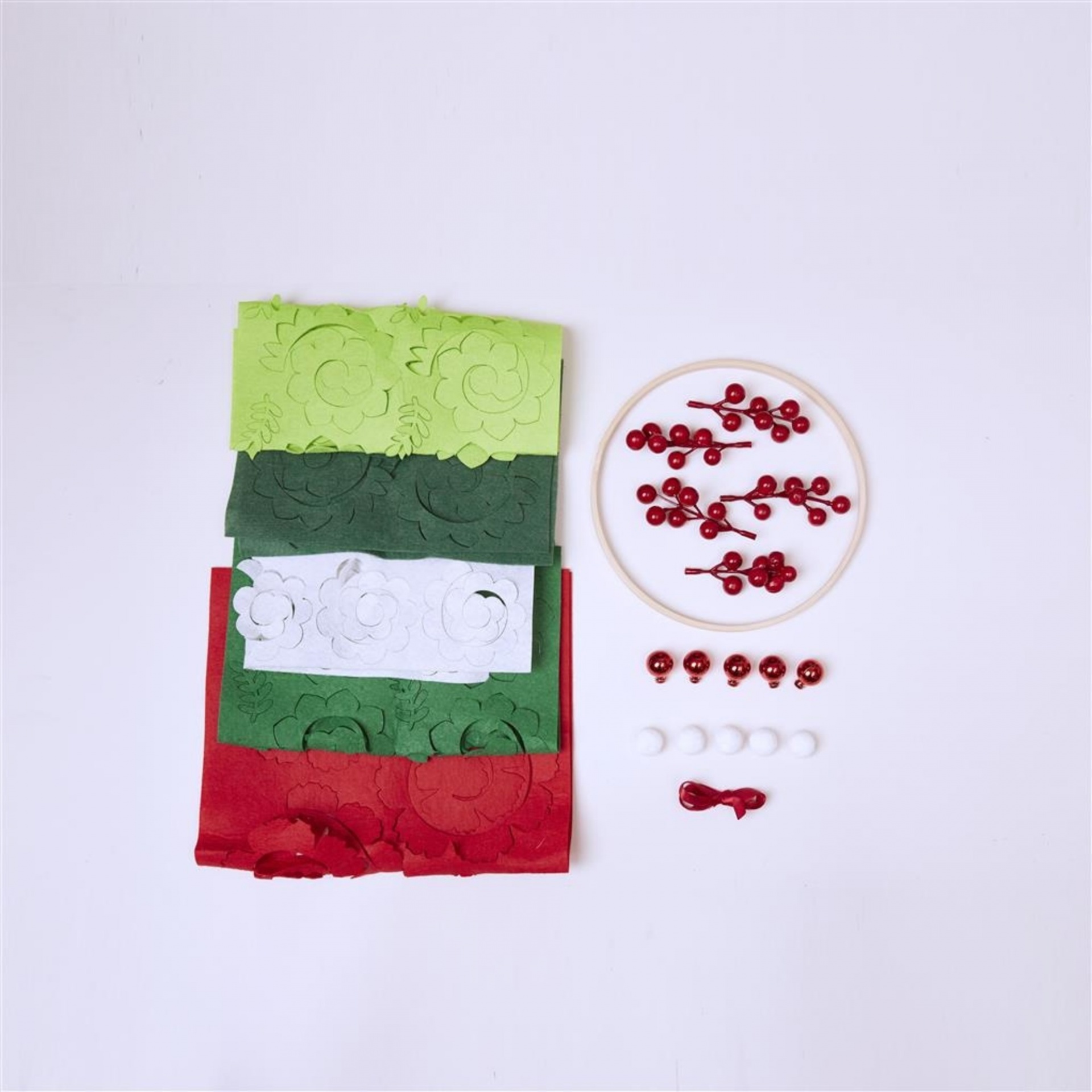 Kit de geinalda de feltro da Simply Make que permite que personalize e decore as suas portas da frente com sua própria decoração artesanal usando cores vibrantes e design floral. Seguindo as instruções incluídas, pode criar a sua própria coroa de flores Kit Contém: Peças de feltro. Aro de madeira. Bagas. Pompons. Mini bolachas. Fita.