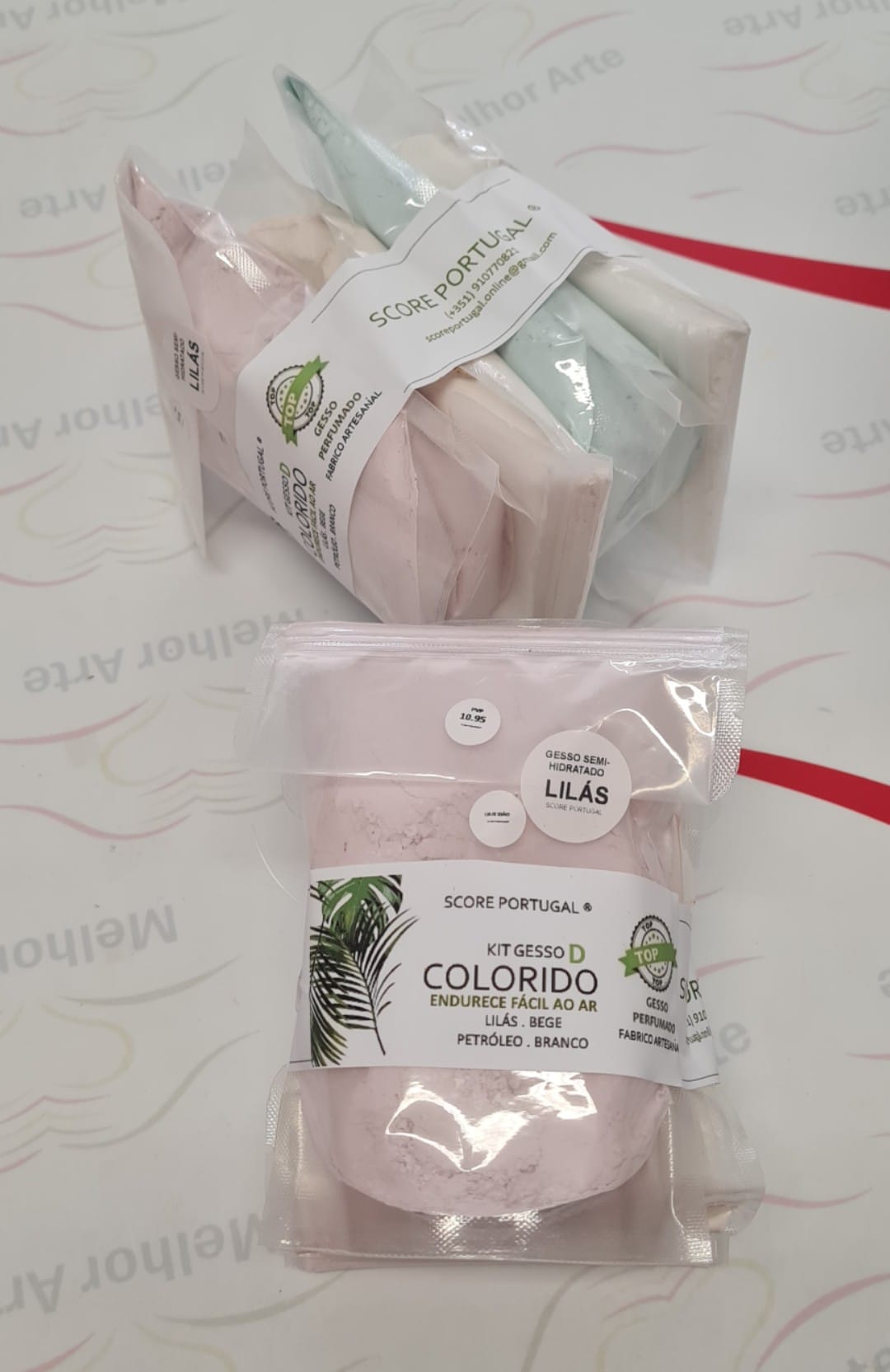 Kits de gesso colorido Score Portugal em embalagens transparentes com etiquetas brancas e texto em português.
