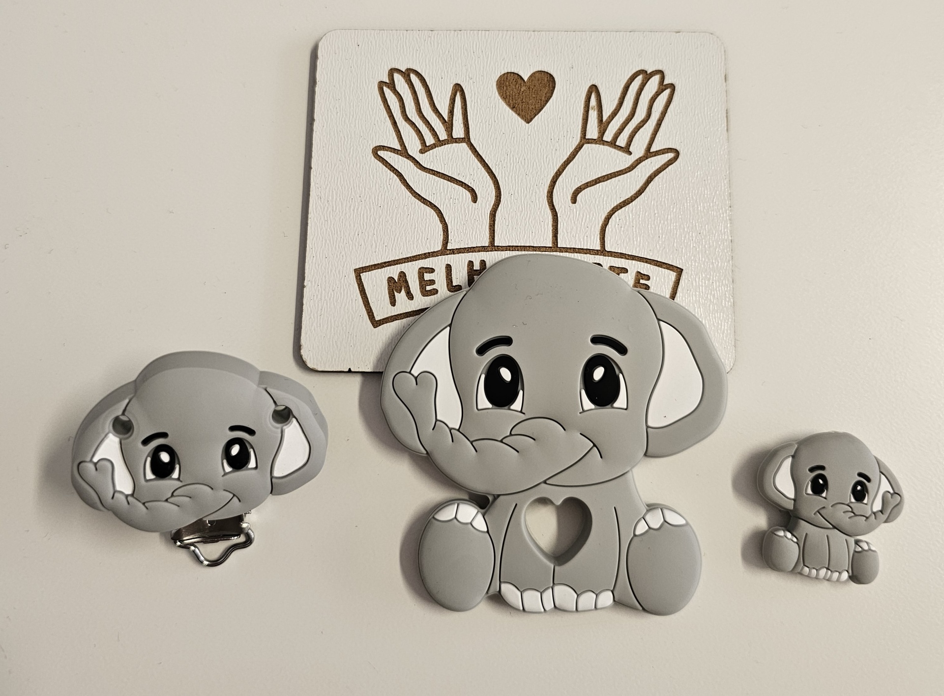 Brinquedos de silicone cinzentos em forma de elefantes com olhos grandes sobre fundo branco com cartão decorativo.