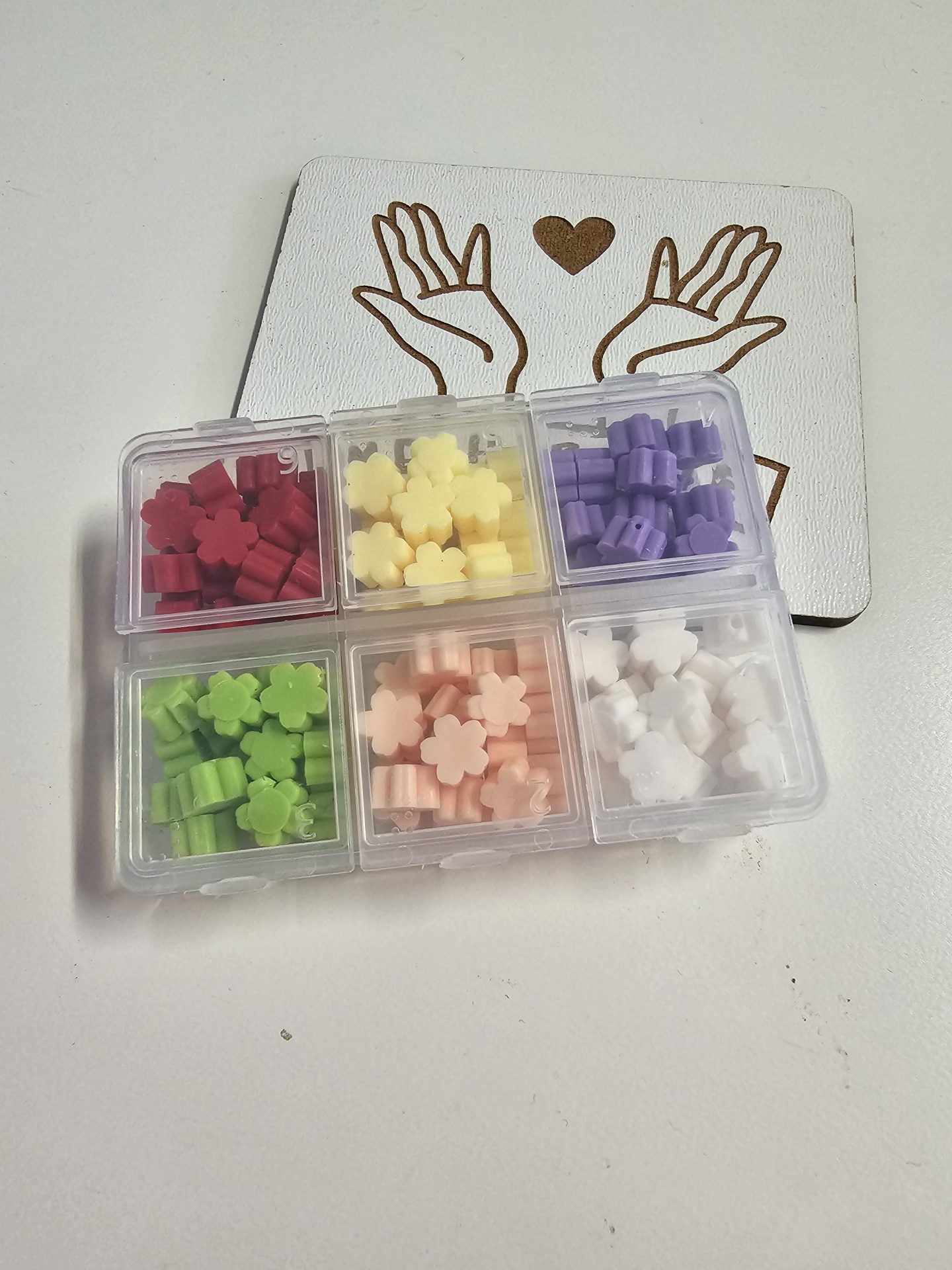 Caixa plástica com pequenos objetos florais coloridos sobre cartão com ilustração de mãos e coração