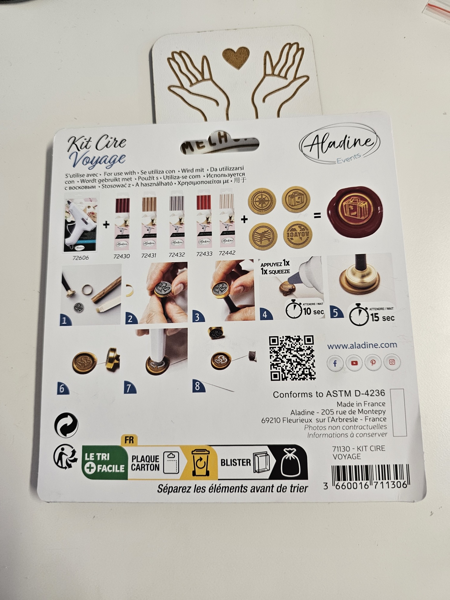 Kit selos de cera Aladine com bastão de cera, selo metálico e instruções de uso