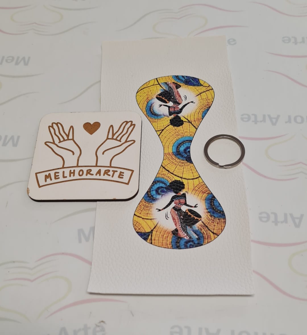 Marcador de livros em pele branca com padrão colorido, porta-chaves metálico e quadrado de madeira com desenho e texto MELHORARTE