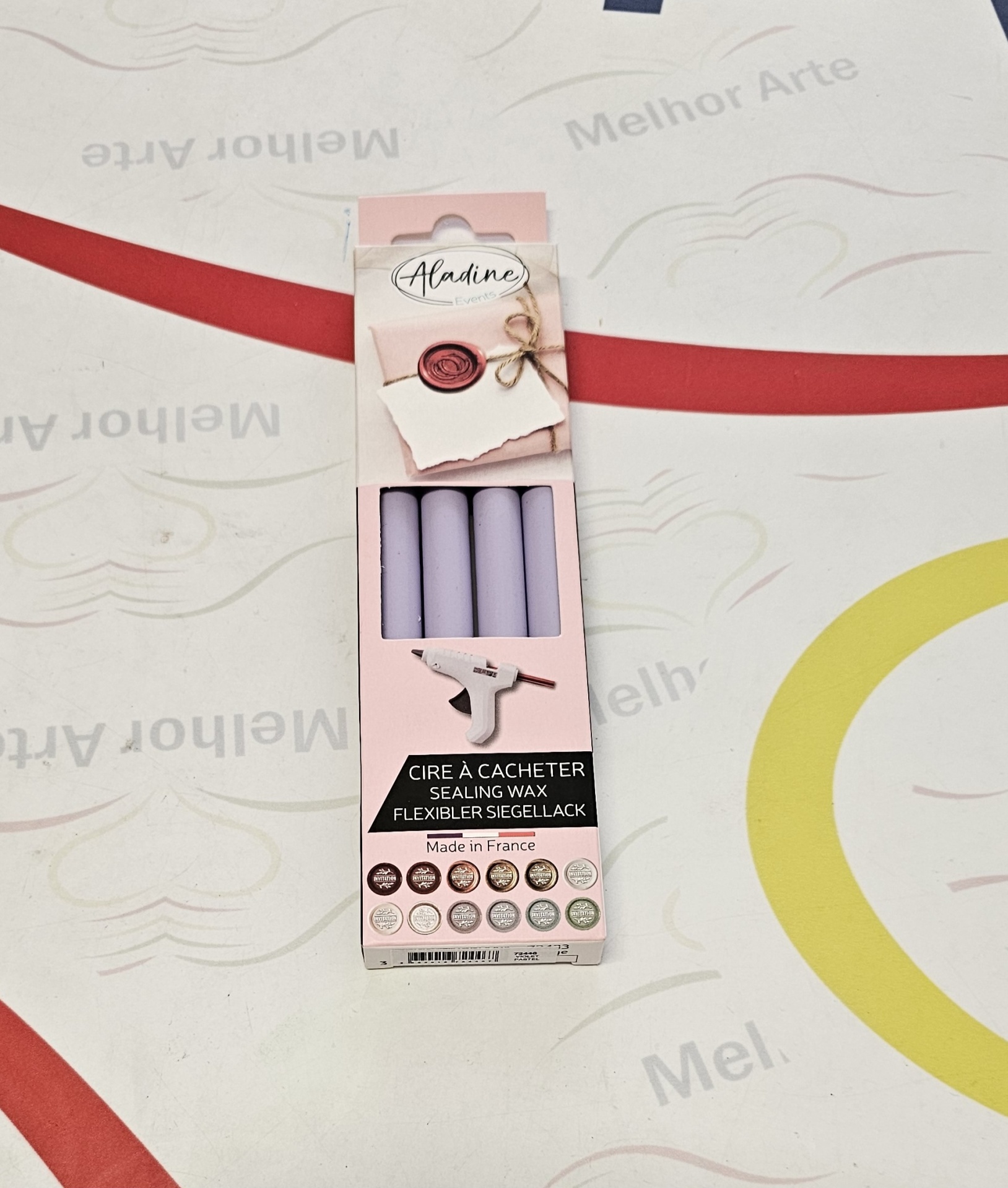 Varetas de cera lilás para lacre Aladine em embalagem rosa