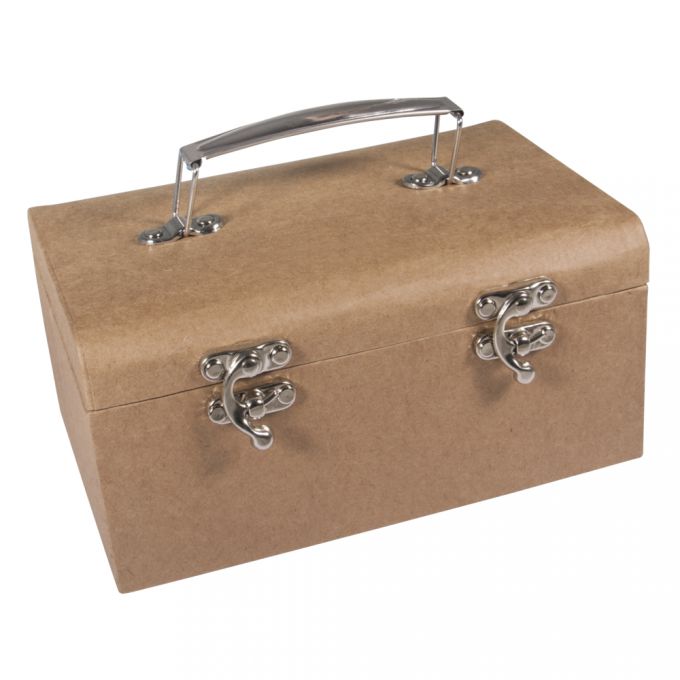 Mala de papel machê tem as dimensões de 19x13x9 cm e possui uma alça de metal e dois fechos de metal