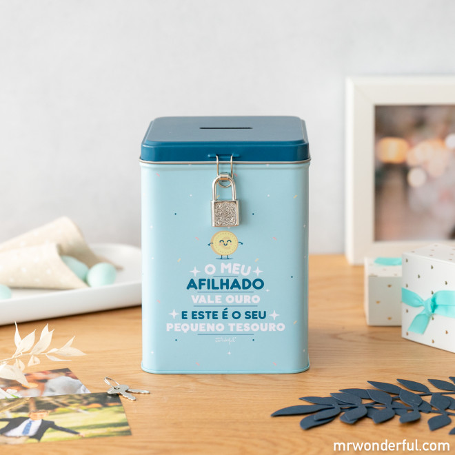 - Mealheiro metálico com fecho a cadeado, com mensagem Mr. Wonderful dedicada a afilhados