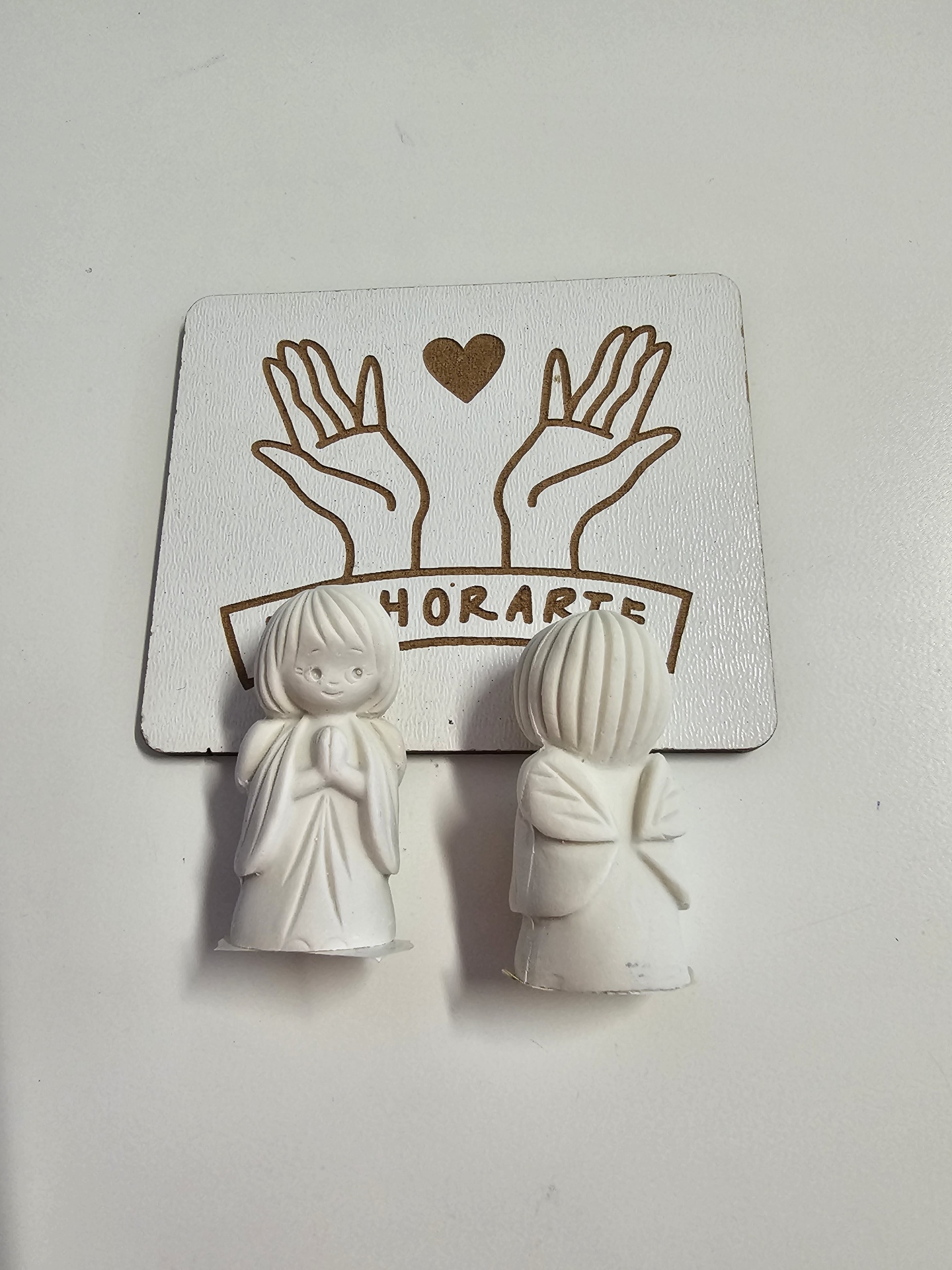 Duas figuras brancas de anjo em cerâmica ou gesso com mãos em oração