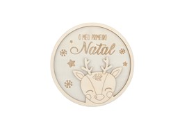 Prato decorativo redondo de madeira com texto e ilustração de rena