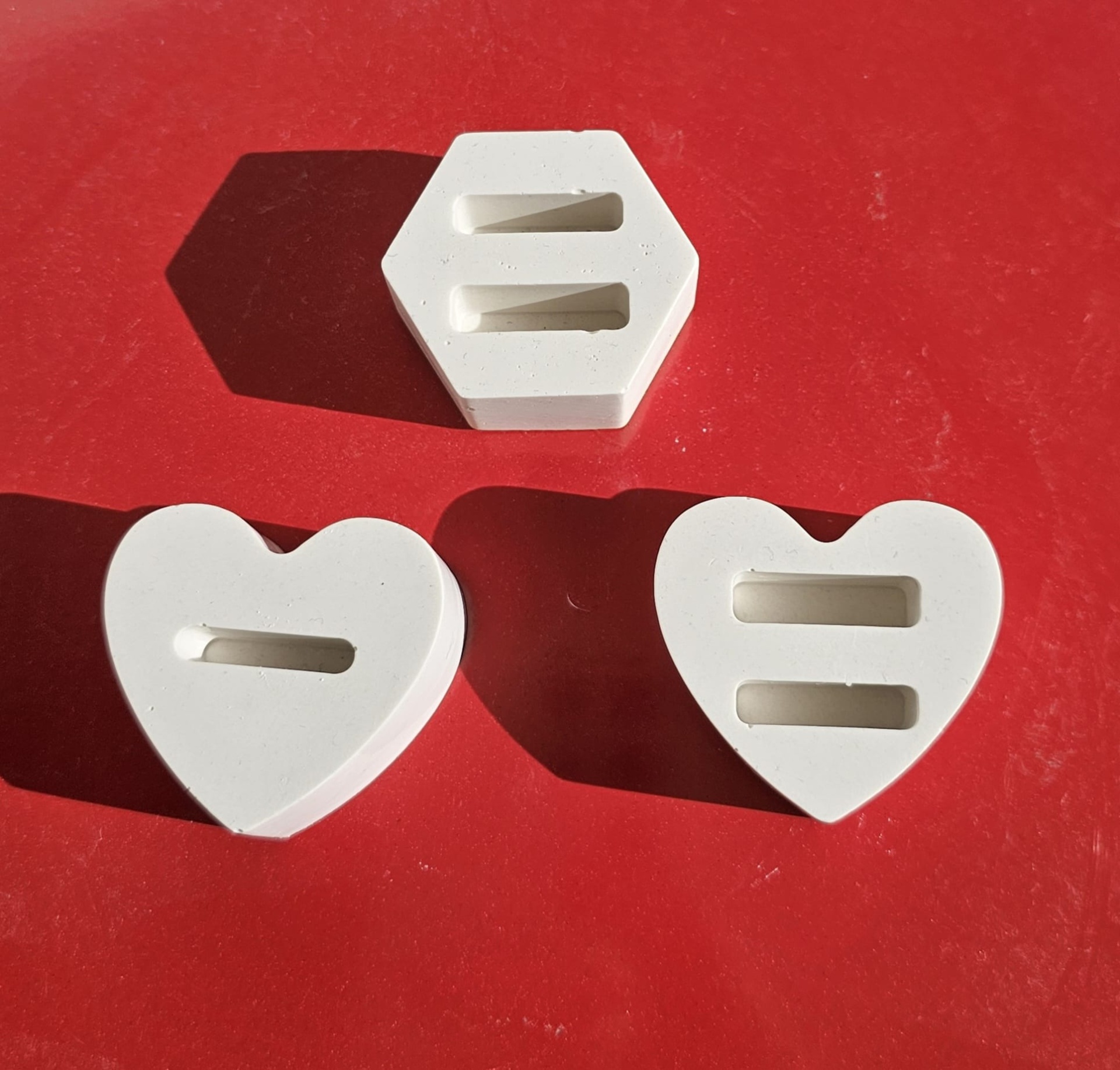Três moldes de silicone em formatos hexagonal e coração sobre fundo vermelho