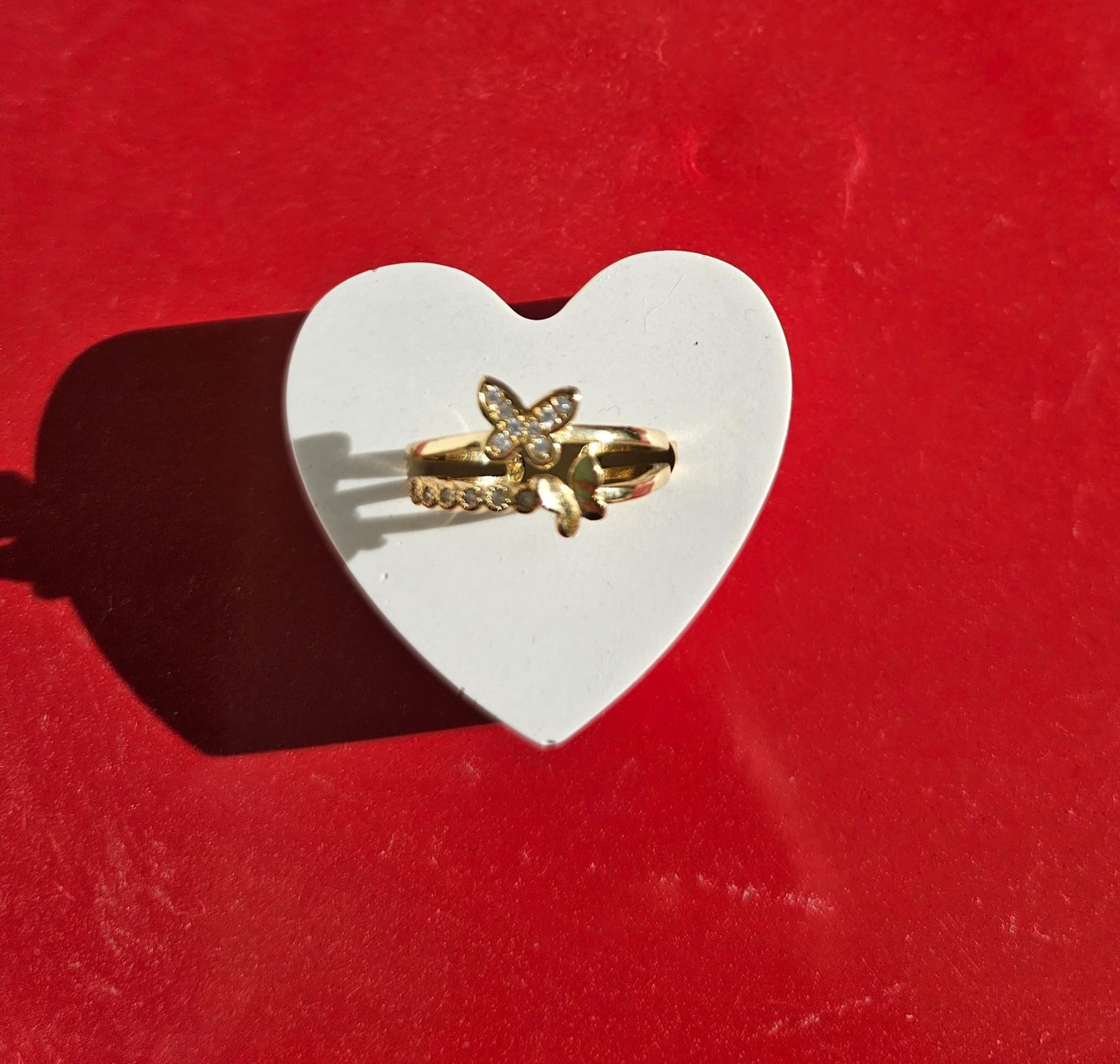 Anel dourado com flor e pedras brancas numa base branca em forma de coração.