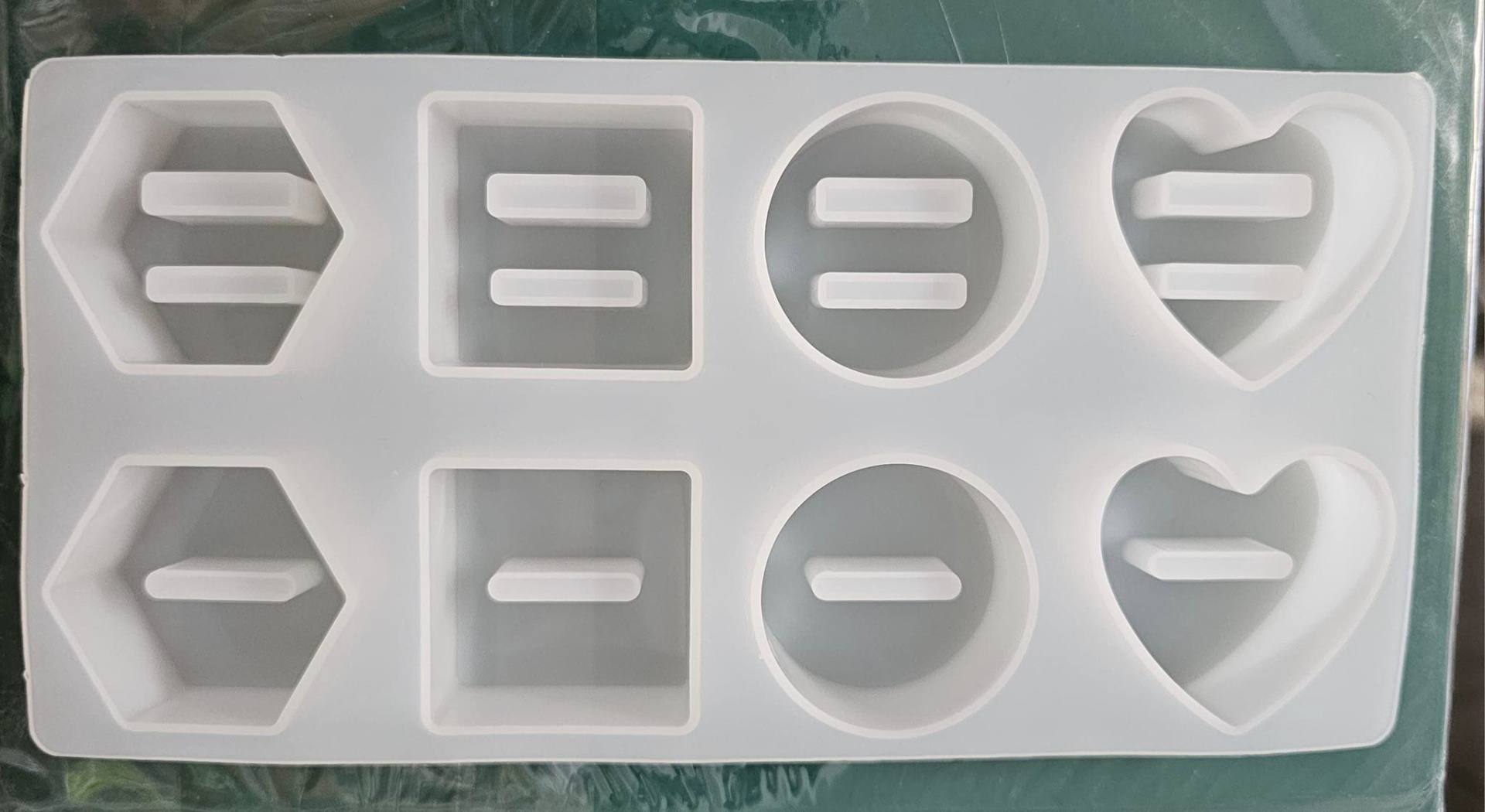 Forma de silicone branca com cavidades em formatos variados, incluindo hexágono, retângulo, círculo e coração.