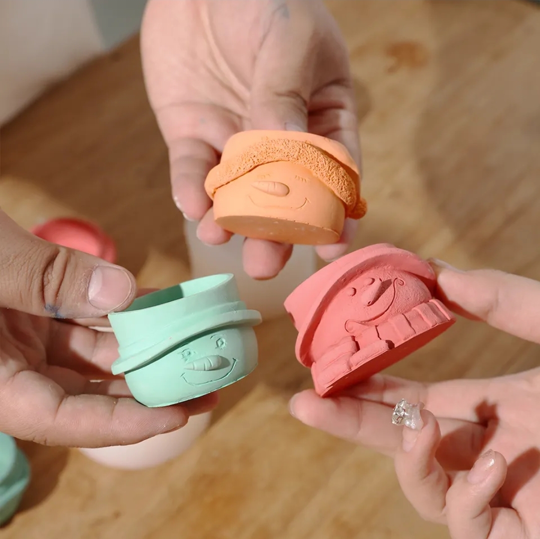 Brinquedos de silicone coloridos com rostos sorridentes nas mãos sobre mesa de madeira