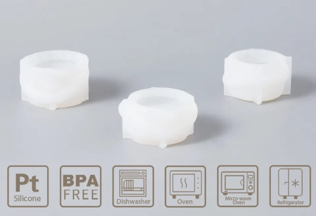moldes cilíndricos e copos de silicone coloridos com líquido sendo vertido