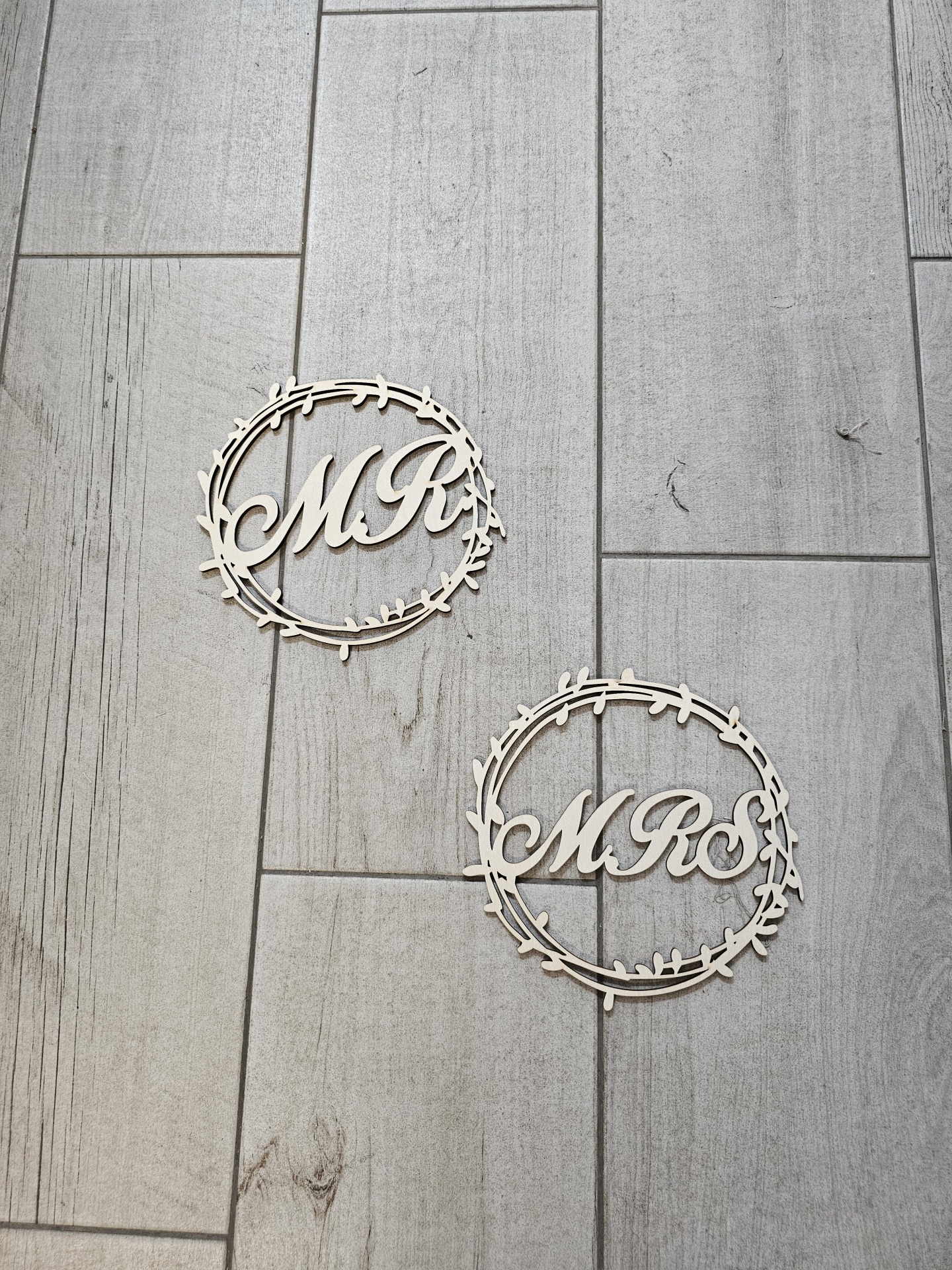 Dois enfeites de madeira com letras MR e MRS em círculos com padrão de ramos sobre piso de madeira cinzenta