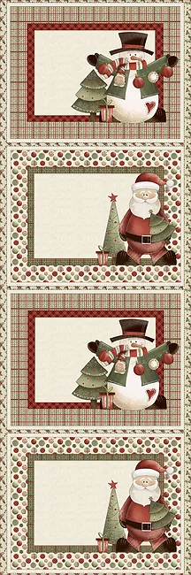 Desenhos de boneco de neve e Pai Natal em molduras decorativas com padrões xadrez e bolinhas