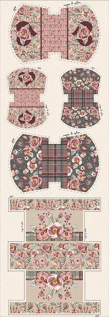 Recortes para embalagens com padrões florais e xadrez em tons rosa, vermelho, verde e bege