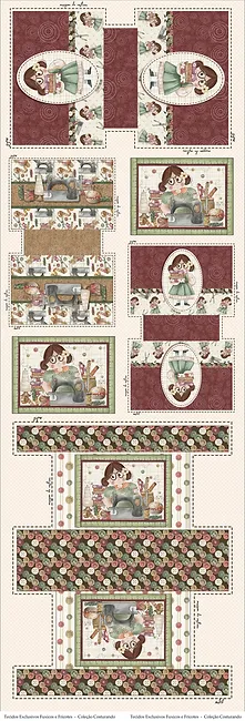 tecido impresso para costura com desenhos de boneca, máquina de costura e flores em tons vermelhos e verdes