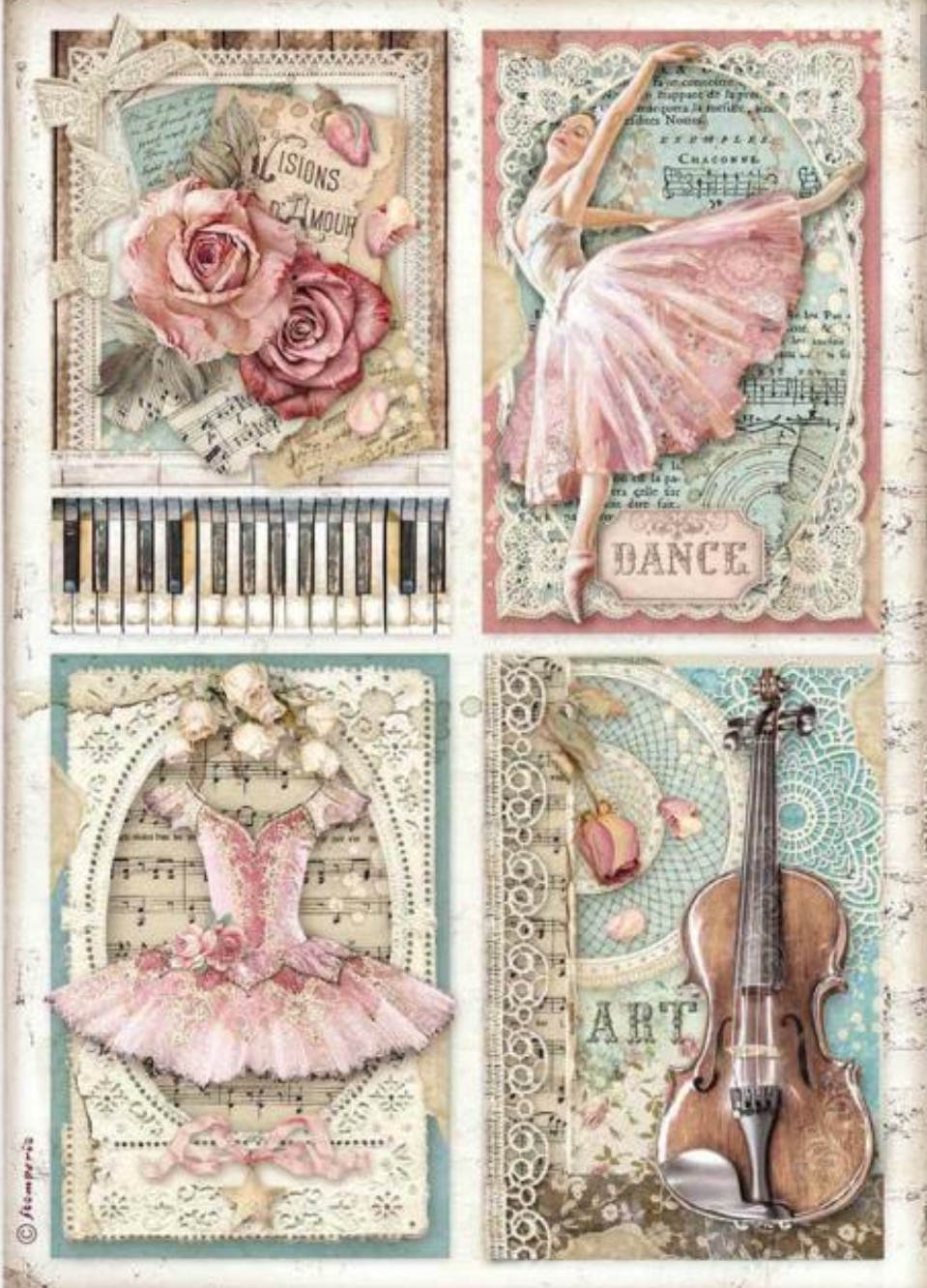 Imagem artística com bailarina, vestido, violino, rosas e partituras com temas musicais e dança.