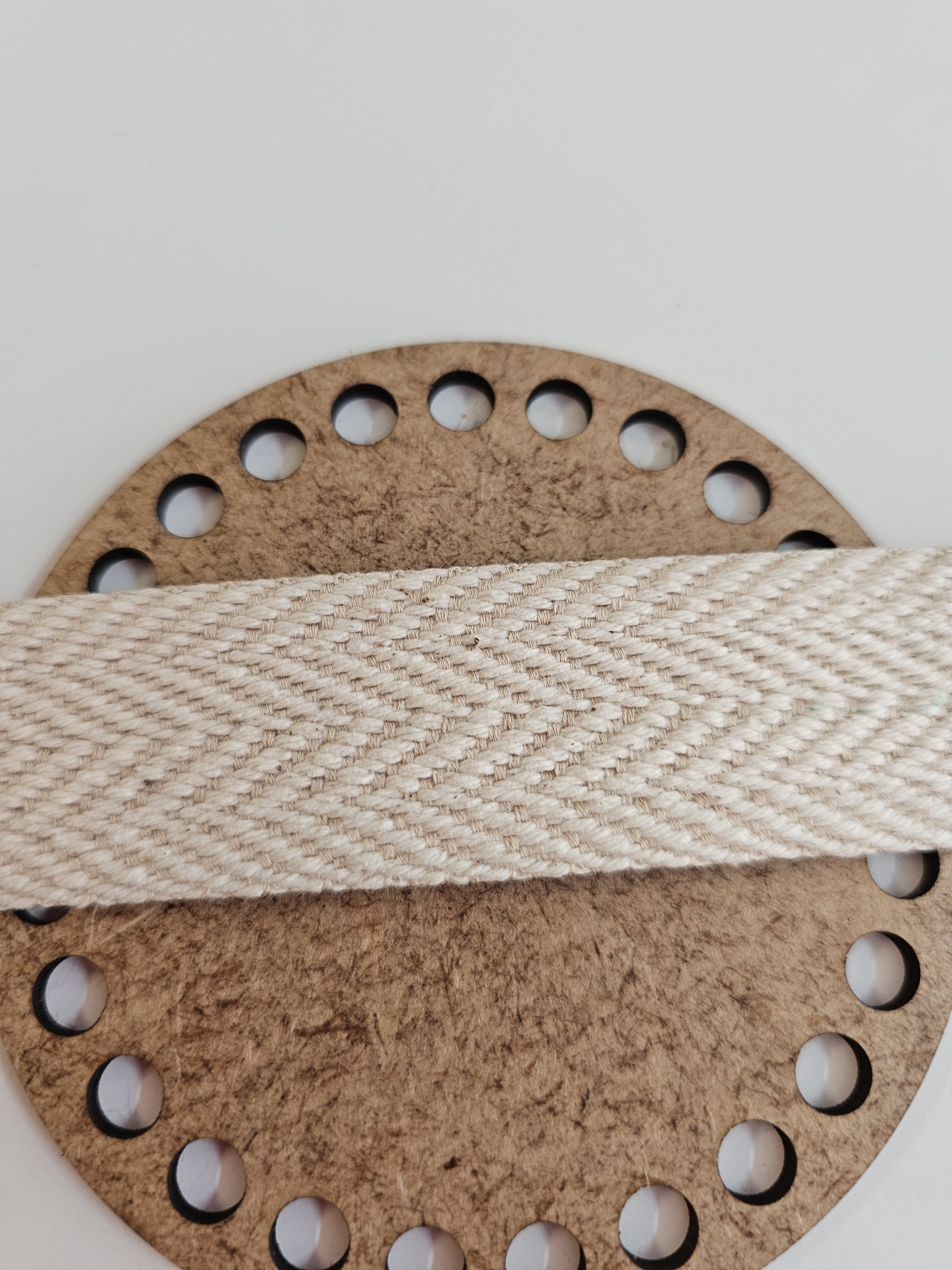 Tira de tecido bege com padrão em ziguezague sobre disco de madeira furado