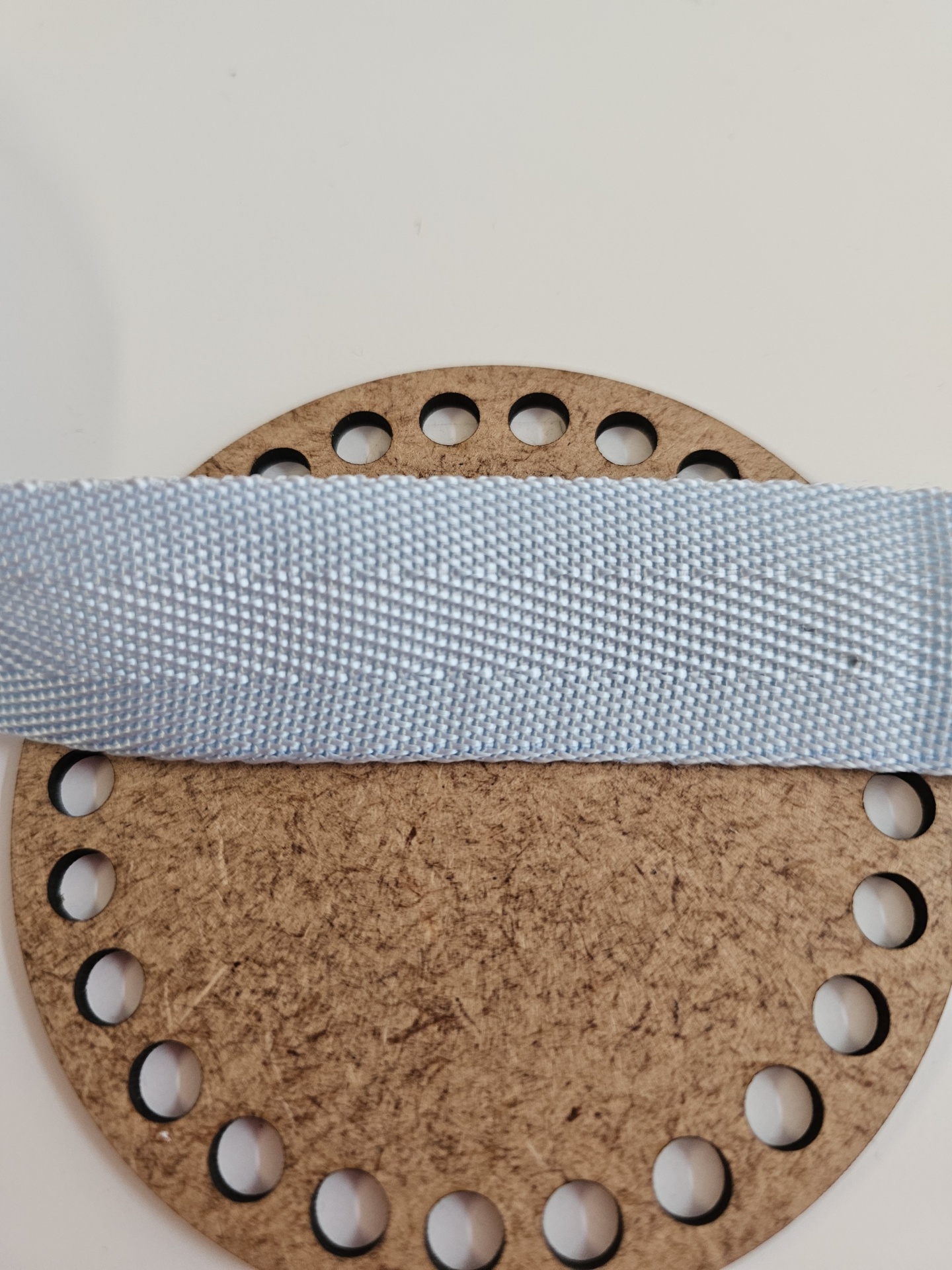 Tira de tecido cinzento claro sobre suporte redondo de madeira com orifícios